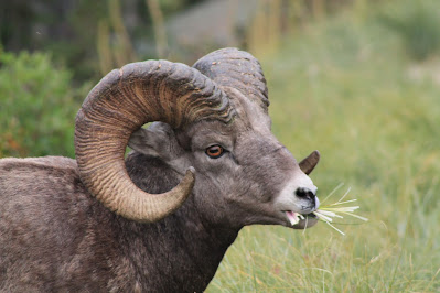 | This guy was hungry, and not at all afraid of people! He was way too close to us with his big horns! Did you know that each of his horns can weigh 15 pounds! The huckleberries, thimble berries (they look like red raspberries, but the plants don't have thorns) and service berries (saskatoons, an important berry to the indigenous peoples) were plentiful most of August and September. I developed what Mark called " hand to mouth disease"! As we hiked my hand kept grabbing berries and putting them in my mouth. I called them grab and go berries, because if I stopped too long to pick them my fellow hikers would become impatient with me. So I became skilled in grabbing them, and I just kept going most of the time!